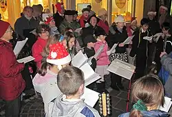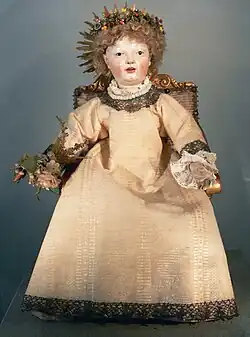 Nativity scenes are known from 10th-century Rome. They were popularised by Saint Francis of Assisi from 1223, quickly spreading across Europe.[128] Different types of decorations developed across the Christian world, dependent on local tradition and available resources, and can vary from simple representations of the crib to far more elaborate sets – renowned manger scene traditions include the colourful Kraków szopka in Poland,[129] which imitate Kraków's historical buildings as settings, the elaborate Italian presepi (Neapolitan, Genoese and Bolognese),[130][131][132][133] or the Provençal crèches in southern France, using hand-painted terracotta figurines called santons.[134] In certain parts of the world, notably Sicily, living nativity scenes following the tradition of Saint Francis are a popular alternative to static crèches.[135][136][137] The first commercially produced decorations appeared in Germany in the 1860s, inspired by paper chains made by children.[138] In countries where a representation of the Nativity scene is very popular, people are encouraged to compete and create the most original or realistic ones. Within some families, the pieces used to make the representation are considered a valuable family heirloom.[139]