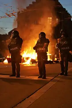 In the third round Blocher beat Metzler with 121 to 116 votes.[37] The election was anticipated as a major media event[38] and widely watched as a live broadcast. After Blocher's election, members of the Swiss political Left spontaneously protested.[39]