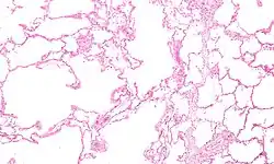 COPD develops as a significant and chronic inflammatory response to inhaled irritants which ultimately leads to bronchial and alveolar remodelling in the lung known as small airways disease.[93][94][95] Thus, airway remodelling with narrowing of peripheral airway and emphysema are responsible for the alteration of lung function.[55] Mucociliary clearance is particularly altered with a dysregulation of cilia and mucus production.[96] Small airway disease sometimes called chronic bronchiolitis, appears to be the precursor for the development of emphysema.[97] The inflammatory cells involved include neutrophils and macrophages, two types of white blood cells. Those who smoke additionally have cytotoxic T cell involvement, and some people with COPD have eosinophil involvement similar to that in asthma. Part of this cell response is brought on by inflammatory mediators such as chemotactic factors. Other processes involved with lung damage include oxidative stress produced by high concentrations of free radicals in tobacco smoke and released by inflammatory cells and breakdown of the connective tissue of the lungs by proteases (particularly elastase) that are insufficiently inhibited by protease inhibitors. The destruction of the connective tissue of the lungs leads to emphysema, which then contributes to the poor airflow and finally, poor absorption and release of respiratory gases. General muscle wasting that often occurs in COPD may be partly due to inflammatory mediators released by the lungs into the blood.[14]