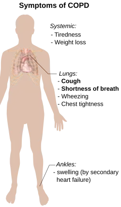 A cardinal symptom of COPD is the chronic and progressive shortness of breath which is most characteristic of the condition. Shortness of breath (breathlessness) is often the most distressing symptom, responsible for the associated anxiety and level of disability experienced.[4] Symptoms of wheezing and chest tightness associated with breathlessness can be variable over the course of a day or between days and are not always present. Chest tightness often follows exertion.[4] Many people with more advanced COPD breathe through pursed lips, which can improve shortness of breath.[24] Shortness of breath is often responsible for reduced physical activity, and low levels of physical activity are associated with worse outcomes.[25][26] In severe and very severe cases there may be constant tiredness, weight loss, muscle loss and anorexia. People with COPD often have increased breathlessness and frequent colds before seeking treatment.[4]