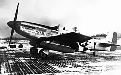 At the time of his flight training acceptance, he was a crew chief on an AT-11.[12] He received his pilot wings and a promotion to flight officer at Luke Field, Arizona, where he graduated from Class 43C on March 10, 1943. Assigned to the 357th Fighter Group at Tonopah, Nevada, he initially trained as a fighter pilot, flying Bell P-39 Airacobras (being grounded for seven days for clipping a farmer's tree during a training flight),[13] and shipped overseas with the group on November 23, 1943.[14]