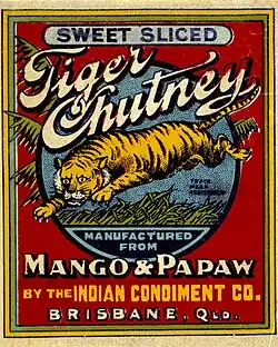 South African Cape Malay chutneys are called blatjang, and are at least somewhat spicy. They can be made using fruits such as apricots, mangoes, or peaches, cooked with vinegar, brown sugar, onions, garlic, and spices.[36][37] In Australia, "Tiger Chutney. Pawpaw and Mango, made by the Indian Condiment Co." was advertised in the 1950s.[31]