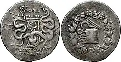 Besides his activity in ameliorating the hard pecuniary situation of the province, Cicero was also creditably active in the military sphere. Early in his governorship he received information that prince Pacorus, son of Orodes II the king of the Parthians, had crossed the Euphrates, and was ravaging the Syrian countryside and had even besieged Cassius (the interim Roman commander in Syria) in Antioch.[105] Cicero eventually marched with two understrength legions and a large contingent of auxiliary cavalry to Cassius's relief. Pacorus and his army had already given up on besieging Antioch and were heading south through Syria, ravaging the countryside again. Cassius and his legions followed them, harrying them wherever they went, eventually ambushing and defeating them near Antigonea.[106]
