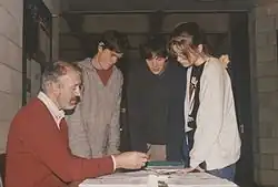 Reserved and private, Murphy professes a lack of interest in the celebrity scene, finding the red carpet experience "a challenge" that he does not "want to overcome".[117] He intentionally practises a lifestyle that will not interest the tabloids, stating, "I haven't created any controversy, I don't sleep around, I don't go and fall down drunk".[4] He prefers not to speak about his life outside of acting and did not appear on any television talk shows until 2010, when he was a guest on Ireland's Late Late Show to promote Perrier's Bounty, though he still remained reserved.[118][119] Murphy's introverted nature and lack of interest in social media has prompted several fans to create memes on his detached demeanour in press interviews and junkets.[120][121] In 2017, upon being asked his opinion on the "Disappointed Cillian Murphy" meme, he answered, "What's a meme?".[122][123]