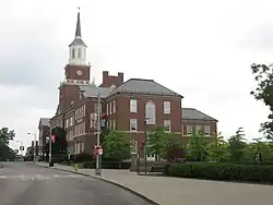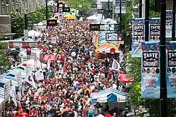 Downtown Cincinnati is the city's central business district and contains a number of neighborhoods in the flat land between the Ohio River and uptown. These neighborhoods include Over-the-Rhine, Pendleton, Queensgate, and West End. Over-the-Rhine is among the largest, most intact urban historic districts in the United States.[81] Most of Over-the-Rhine's ornate brick buildings were built by German immigrants from 1865 to the 1880s.[82] The neighborhood has been intensely redeveloped in the 21st century, with a focus on fostering small businesses.[83]