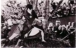 Japanese films gained popularity in the mid-1920s against foreign films, in part fueled by the popularity of movie stars and a new style of jidaigeki. Directors such as Daisuke Itō and Masahiro Makino made samurai films like A Diary of Chuji's Travels and Roningai featuring rebellious antiheroes in fast-cut fight scenes that were both critically acclaimed and commercial successes.[28] Some stars, such as Tsumasaburo Bando, Kanjūrō Arashi, Chiezō Kataoka, Takako Irie and Utaemon Ichikawa, were inspired by Makino Film Productions and formed their own independent production companies where directors such as Hiroshi Inagaki, Mansaku Itami and Sadao Yamanaka honed their skills. Director Teinosuke Kinugasa created a production company to produce the experimental masterpiece A Page of Madness, starring Masao Inoue, in 1926.[29] Many of these companies, while surviving during the silent era against major studios like Nikkatsu, Shochiku, Teikine, and Toa Studios, could not survive the cost involved in converting to sound.