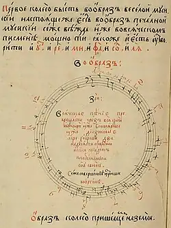 The first circle of fifths diagram appears in the Grammatika (1677) of the composer and theorist Mykola Pavlovych Dyletsky, who intended to present music theory as a tool for composition.[7] It was "the first of its kind, aimed at teaching a Russian audience how to write Western-style polyphonic compositions."[7]