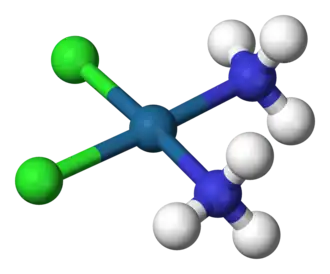 Cisplatin is the square planar coordination complex cis-[Pt(NH3)2Cl2].[32]: 286–8 [33]: 689 The prefix cis indicates the cis isomer in which two similar ligands are in adjacent positions.[32][33]: 550 The systematic chemical name of this molecule is cis–diamminedichloroplatinum,[32]: 286 where ammine with two m's indicates an ammonia (NH3) ligand, as opposed to an organic amine with one m.[32]: 284