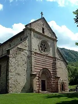 Fossanova Abbey, in the municipality of Priverno (province of Latina), is the oldest example of Cistercian Gothic architecture in Italy. It arose at the end of the 12th century from the transformation of a pre-existing Benedictine monastery, granted in 1134 by Pope Innocent II to Burgundian monks. The church was consecrated in 1208.[58] Saint Thomas Aquinas died in this abbey on March 7, 1274.