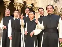 Vietnamese Cistercian monks standing in a cloister and wearing their religious habits