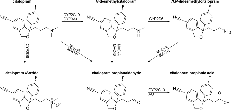 Citalopram is metabolized in the liver mostly by CYP2C19, but also by CYP3A4 and CYP2D6. Metabolites desmethylcitalopram and didesmethylcitalopram are significantly less energetic and their contribution to the overall action of citalopram is negligible. The half-life of citalopram is about 35 hours. Approximately 80% is cleared by the liver and 20% by the kidneys.[71] The elimination process is slower in the elderly and in patients with liver or kidney failure. With once-daily dosing, steady plasma concentrations are achieved in about a week. Potent inhibitors of CYP2C19 and 3A4 might decrease citalopram clearance.[9] Tobacco smoke exposure was found to inhibit the biotransformation of citalopram in animals, suggesting that the elimination rate of citalopram is decreased after tobacco smoke exposure. After intragastric administration, the half-life of the racemic mixture of citalopram was increased by about 287%.[72]