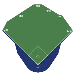 | Field size | Left field line - 335 feet (102 m) Left center - 358 feet (109 m) Deep left center - 385 feet (117 m) Center field - 408 feet (124 m) Deep right center - 398 feet (121 m) Right center - 375 feet (114 m) Right field line - 330 feet (101 m) ![]() |