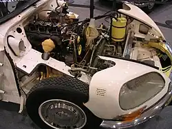 The car used double wishbone suspension with L-shaped arms at the front and trailing-arms at the rear, with totally novel hydropneumatic spring and damper units. The car's advanced hydraulics included automatic self-levelling and driver adjustable ride-height,[21] developed in-house by Paul Magès. This suspension allowed the DS to travel quickly on the poor road surfaces then common in France.[22]