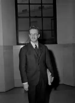 Brooklyn College was also referred to as a "hotbed of Communism" in the era of the Red Scare.[49] Republican representative J. Parnell Thomas, a member of the Dies Committee, stated that he believed "25 per cent of the pupils in Brooklyn College, which is part of the City College of New York, are either affiliated with or sympathetic to the Communist party and that 33 per cent of the professors of Brooklyn College are just as sympathetic as the students."[49] In the words of Brooklyn College archivist Marianna Labatto, President Harry Gideonse, who served from 1939 to 1966, believed that if academia did not provide moral, social, as well as intellectual guidance, "the void would be filled by popular culture and totalitarian regimes."[50] This led to the creation of committees to oversee student activities and thus deter from Communist influence. The work of the Faculty-Student Committee on Student Groups and Organizations led to the prevention of leader of the Communist Party USA, Earl Browder, from speaking to the Karl Marx Society of Brooklyn College in 1939.[51] It also suppressed student publications through suspensions and the revocation of charters.