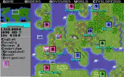 Meier described his development process as sculpting with clay.[9] His prototype took elements from Empire, Railroad Tycoon, SimCity and the Civilization board game.[8] This initial version of this game was a real-time simulation, with the player defining zones for their population to grow similar to zoning in SimCity.[2] Meier and Shelley went back and forth with this, with Shelley providing suggestions based on his playthrough and acting as the game's producer, and Meier coding and reworking the game to address these points, and otherwise without involvement of other MicroProse staff.[2] During this period, Stealey and the other managers became concerned that this game did not fit MicroProse's general catalog as strategy computer games had not yet proven successful.[8] A few months into the development, Stealey requested them to put the project on hold and complete Covert Action, after which they could go back to their new game. Meier and Shelley completed Covert Action which was published in 1990.[2]