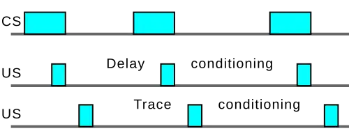 • Trace conditioning: During trace conditioning, the CS and US do not overlap. Instead, the CS begins and ends before the US is presented. The stimulus-free period is called the trace interval or the conditioning interval. If in the above buzzer example, the puff came a second after the sound of the buzzer stopped, that would be trace conditioning, with a trace or conditioning interval of one second.