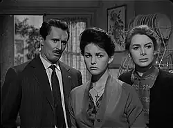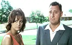In 1959 she appeared opposite Renato Salvatori in the mafia film Vento del sud and played the wife of Maurizio Arena in Luigi Zampa's Il magistrato.[31] Cardinale also starred opposite Pietro Germi in his crime film The Facts of Murder, an important assignment for her in mastering the craft of acting while learning to feel at ease in front of the camera.[32] Cardinale considered it to have been her first real test as an actress.[33] She then played the role of Maria in Ralph Thomas's British film Upstairs and Downstairs, which starred Michael Craig and Anne Heywood.[34][35] In her early roles, she was usually dubbed, as producers considered her voice too hoarse.[36]