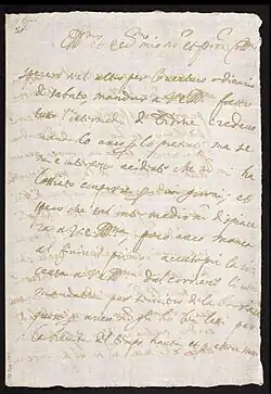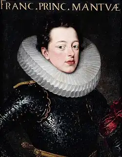 The relative freedom which the Republic of Venice afforded him, compared to the problems of court politics in Mantua, are reflected in Monteverdi's letters to Striggio, particularly his letter of 13 March 1620, when he rejects an invitation to return to Mantua, extolling his present position and finances in Venice, and referring to the pension which Mantua still owes him.[37] Nonetheless, remaining a Mantuan citizen, he accepted commissions from the new Duke Ferdinando, who had formally renounced his position as Cardinal in 1616 to take on the duties of state. These included the balli Tirsi e Clori (1616) and Apollo (1620), an opera Andromeda (1620) and an intermedio, Le nozze di Tetide, for the marriage of Ferdinando with Caterina de' Medici (1617). Most of these compositions were extensively delayed in creation – partly, as shown by surviving correspondence, through the composer's unwillingness to prioritise them, and partly because of constant changes in the court's requirements.[n 4] They are now lost, apart from Tirsi e Clori, which was included in the seventh book of madrigals (published 1619) and dedicated to the Duchess Caterina, for which the composer received a pearl necklace from the Duchess.[31][36][39] A subsequent major commission, the opera La finta pazza Licori, to a libretto by Giulio Strozzi, was completed for Fernando's successor Vincenzo II, who succeeded to the dukedom in 1626. Because of the latter's illness (he died in 1627), it was never performed, and it is now also lost.[31]