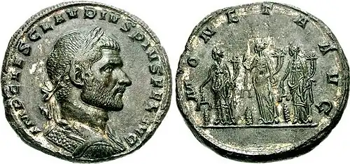 ![]() Gold medallion (worth 8 aurei) depicting Claudius Gothicus. Legend: imp c m aurl claudius p f aug | |||||||||
