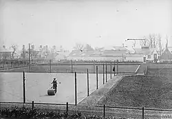 Courts covered in a top layer of brick dust thereafter became the norm in many Mediterranean and South American countries, as they are not only durable in summer but do not need to be tended and mowed, unlike grass courts (although they do require regular maintenance involving rolling, "dragging", and occasional watering). Yet further improvements were still imperative, as the bounce on these courts was often irregular, the surface dried slowly after rain had fallen, and the courts could not be used in winter months for fear of damage. In 1909, the newly-established Leicestershire firm En-Tout-Cas (translated roughly into English as "in all conditions") came up with a prototype court made from crushed brick and burnt shale that could drain much more quickly than standard clay courts. These proved very popular once offered as a product, and by the 1920s the company was responsible for laying clay courts for the Davis Cup and at the French, British and Canadian Championships.[4] During the following decade the American engineer H. A. Robinson went still further, creating a surface based on classic clay augmented with green piled metabasalt rock, which he hoped would help deliver a more consistent bounce. This became known as Har-Tru, derived from Robinson's initials and the 'true' nature of the bounce experienced on the court.[5] First used in Hagerstown, Maryland, in 1932, green Har-Tru clay soon became the preferred surface for American clay court tournaments. In later years, the Har-Tru company would go on to develop all-weather clay surfaces at its factory in Charlottesville, Virginia, that could be played on throughout the entire year.[6]