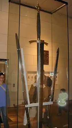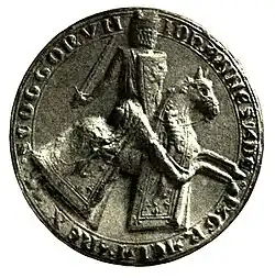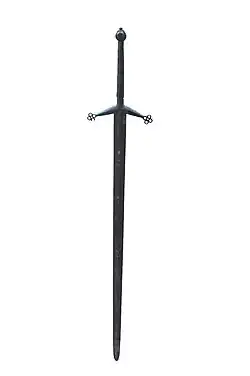 The two-handed claymore was a large sword used in the late Medieval and early modern periods. It was used in the constant clan warfare and border fights with the English from c. 1400 to 1700.[9] Although claymores existed as far back as the Wars of Scottish Independence, they were smaller and few had the typical quatrefoil design (as can be seen on the Great Seal of John Balliol King of Scots).[10] The last known battle in which it is considered to have been used in a significant number was the Battle of Killiecrankie in 1689. It was somewhat longer than other two-handed swords of the era. The English did use swords similar to the Claymore during the renaissance called a greatsword. The two-handed claymore seems to be an offshoot of early Scottish medieval longswords (similar to the espee de guerre or grete war sword) which had developed a distinctive style of a cross-hilt with forward-angled arms that ended in spatulate swellings. The lobed pommels on earlier swords were inspired by the Viking style. The spatulate swellings were later frequently made in a quatrefoil design.[11]