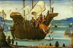 According to apocryphal acta dating to the 4th century at earliest, Clement was banished from Rome to the Chersonesus during the reign of the Emperor Trajan[4][2] and was set to work in a stone quarry. Finding on his arrival that the prisoners were suffering from lack of water, he knelt down in prayer. Looking up, he saw a lamb on a hill, went to where the lamb had stood and struck the ground with his pickaxe, releasing a gushing stream of clear water. This miracle resulted in the conversion of large numbers of the local pagans and his fellow prisoners to Christianity. As punishment, Clement was martyred by being tied to an anchor[29] and thrown from a boat into the Black Sea. The legend recounts that every year a miraculous ebbing of the sea revealed a divinely built shrine containing his bones. However, the oldest sources on Clement's life, Eusebius and Jerome, note nothing of his martyrdom.[25]: 639