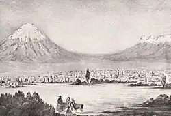 Markham remained in the city for several weeks, researching Inca history, describing in his journal the many buildings and ruins that he visited. During the course of an excursion to nearby towns and ruins he reached the area of San Miguel, La Mar, Ayacucho, where he first learned of the properties of the cinchona plant, a source of quinine, cultivated in that vicinity.[29] He finally left Cuzco on 18 May, accompanied by a party of six who, like him, were returning to Lima. Their journey took them southwards, descending the mountains to the city of Arequipa, a former Spanish colonial settlement with a mixture of native and European architecture.[30] The city is overlooked by the conical volcano Mount Misti, which Markham likened to Mount Fuji in Japan. On 23 June, the party reached Lima, where Markham learned of the death of his father. He departed for England, where he arrived on 17 September.[31]
