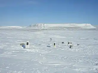 After rounding the southernmost point of Greenland on 28 May, the squadron proceeded northwards until stopped by ice in Melville Bay on 25 June.[19] They were held here until 18 August, when they were finally able to proceed west into Lancaster Sound, the known route taken by Franklin. Here the ships dispersed to search different areas for signs of the vanished expedition. On 23 August, Ommanney sighted a cairn, and discovered packing materials nearby which bore the name of "Goldner", Franklin's canned meat supplier. Together with other odds and ends of abandoned equipment, these fragments were the first traces of Franklin that anyone had found.[19] A few days later, on Beechey Island, the party came across three graves, which proved to be those of members of Franklin's crew who had died between January and April 1846.[19]