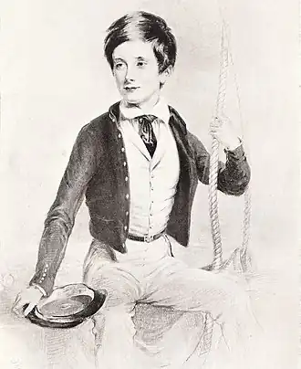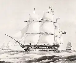 In May 1844, Markham was introduced by his aunt, the Countess of Mansfield, to Rear Admiral Sir George Seymour, a Lord of the Admiralty. The boy made a favourable impression on the admiral, and the meeting led to the offer of a cadetship in the Royal Navy. Accordingly, on 28 June 1844, Markham travelled to Portsmouth to join Seymour's flagship, HMS Collingwood. Collingwood was being fitted out for an extended voyage to the Pacific Ocean where Seymour was to assume command of the Pacific station.[8] This tour of duty lasted for almost four years. The ship reached the Chilean port of Valparaíso, the headquarters of the Pacific station on 15 December 1844, after a cruise that incorporated visits to Rio de Janeiro and the Falkland Islands, and a stormy passage in the Southern Ocean.[9] Markham's social connections assured him of a relatively comfortable time; he was frequently invited to dine with the admiral, whose wife and daughters were on board.[9]