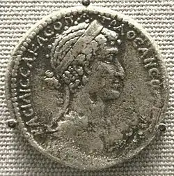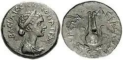 A denarius minted by Antony in 34 BC with his portrait on the obverse, which bears the inscription reading "ANTONI ARMENIA DEVICTA" (For Antony, Armenia having been vanquished), alluding to his Armenian campaign. The reverse features Cleopatra, with the inscription "CLEOPATR[AE] REGINAE REGVM FILIORVM REGVM" (For Cleopatra, Queen of Kings and of the children of kings). The mention of her children on the reverse refers to the Donations of Alexandria.[256][257][258]