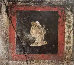 Most likely a posthumously painted portrait of Cleopatra with red hair and her distinct facial features, wearing a royal diadem and pearl-studded hairpins, from Roman Herculaneum, Italy, 1st century AD[47][48][note 16]