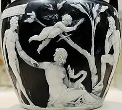 Dellius was sent as Antony's envoy to Artavasdes II in 34 BC to negotiate a potential marriage alliance that would wed the Armenian king's daughter to Alexander Helios, the son of Antony and Cleopatra.[263][264] When this was declined, Antony marched his army into Armenia, defeated their forces and captured the king and the Armenian royal family.[263][265] Antony then held a military parade in Alexandria as an imitation of a Roman triumph, dressed as Dionysus and riding into the city on a chariot to present the royal prisoners to Cleopatra, who was seated on a golden throne above a silver dais.[263][266] News of this event was heavily criticized in Rome as a perversion of time-honored Roman rites and rituals to be enjoyed instead by an Egyptian queen.[263]