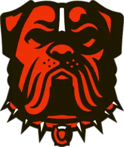 The current logos and wordmarks were introduced on February 24, 2015, with the helmet design remaining largely as is, the only differences being minor color changes to the shade of orange used on the helmet and the facemask being changed from gray to brown.[13][14][89] A new secondary "dawg" logo was introduced in 2023. The logo, featuring a bull mastiff dog, was created by graphic designer Houston Mark and was the winning entry of a fan vote. It features numerous small homages to the city of Cleveland, state of Ohio, and the team's history.[90][91]
