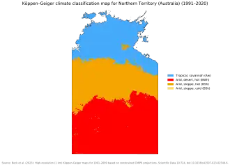 | Katherine[30] | Aw | 34.6 °C (94 °F) | 24.2 °C (76 °F) | 30.4 °C (87 °F) | 13.0 °C (55 °F) | 140.8 | 1,076.8 mm (42 in) |