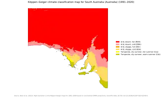 | Whyalla[59] | BSh | 30.2 °C (86 °F) | 17.9 °C (64 °F) | 17.1 °C (63 °F) | 5.3 °C (42 °F) | 62.7 | 266.9 mm (11 in) |