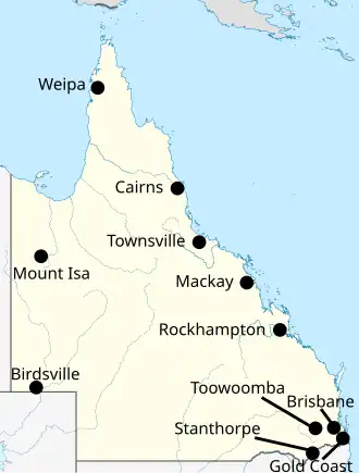 | Gold Coast[40] | Cfa | 28.9 °C (84 °F) | 21.9 °C (71 °F) | 21.3 °C (70 °F) | 12.0 °C (54 °F) | 111.0[41] | 1,254.7 mm (49 in) |