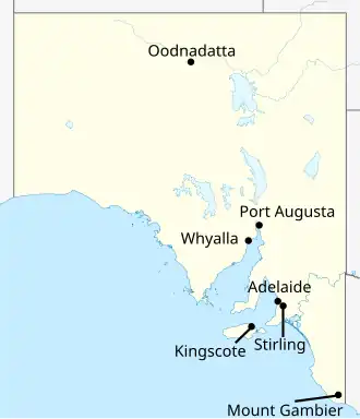 | Port Augusta[56] | BWh | 34.1 °C (93 °F) | 19.5 °C (67 °F) | 18.0 °C (64 °F) | 4.7 °C (40 °F) | 142.1[57] | 217.8 mm (9 in) |