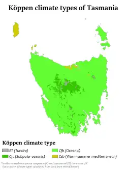 | Flinders Island[64] | Cfb | 22 °C (72 °F) | 14 °C (57 °F) | 13 °C (55 °F) | 6 °C (43 °F) | 47 | 741 mm (29 in) |