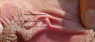 ![]() A fully exposed human clitoral glans, shown below the hood | |
