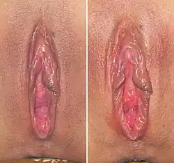 Genital modification may be for aesthetic, medical or cultural reasons.[127] This includes female genital mutilation (FGM), sex reassignment surgery (for trans men as part of transitioning), intersex surgery, and genital piercings.[25][128][129] Use of anabolic steroids by bodybuilders and other athletes can result in significant enlargement of the clitoris along with other masculinizing effects on their bodies.[130][131] Abnormal enlargement of the clitoris may be referred to as clitoromegaly or macroclitoris, but clitoromegaly is more commonly seen as a congenital anomaly of the genitalia.[132]