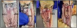 The vestibular bulbs are more closely related to the clitoris than the vestibule because of the similarity of the trabecular and erectile tissue within the clitoris and its bulbs, and the absence of trabecular tissue in other parts of the vulva, with the erectile tissue's trabecular nature allowing engorgement and expansion during sexual arousal.[26][50] The vestibular bulbs are typically described as lying close to the crura on either side of the vaginal opening; internally, they are beneath the labia majora. The anterior sections of the bulbs unite to create the bulbar commissure, which forms a long strip of erectile tissue dubbed the infra-corporeal residual spongy part (RSP)[51][52] that expands from the ventral shaft and terminates as the glans. The RSP is also connected to the shaft via the pars intermedia (venous plexus of Kobelt).[53][54] When engorged with blood, the bulbs cuff the vaginal opening and cause the vulva to expand outward.[26] Although several texts state that they surround the vaginal opening, Ginger et al. state that this does not appear to be the case and tunica albuginea does not envelop the erectile tissue of the bulbs.[26] In Yang et al.'s assessment of the bulbs' anatomy, they conclude that the bulbs "arch over the distal urethra, outlining what might be appropriately called the 'bulbar urethra' in women".[27]