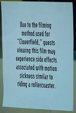 The film's shaky camera style of cinematography, dubbed "La Shakily Queasy-Cam" by Roger Ebert, caused some viewers (particularly in darkened movie theaters) to experience motion sickness, including nausea and a temporary loss of balance. Audience members prone to migraines have cited the film as a trigger. Some theaters showing the film, such as AMC Theatres, provided poster and verbal warnings, informing viewers about the filming style of Cloverfield, while other theatres like Pacific Theatres just verbally warned customers in detail at the box office about experiencing motion sickness upon viewing the film and what to do if they had to step out and vomit.[26]
