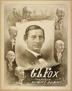America's first great whiteface clown was stage star George "G.L." Fox. Inspired by Grimaldi, Fox popularised the Humpty Dumpty stories throughout the U.S. in the 1860s.
