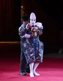 The white clown, or clown blanc in French, is a sophisticated character, as opposed to the clumsy Auguste.[25][26] The two types are also distinguished as the sad clown (blanc) and happy clown (Auguste).[27]