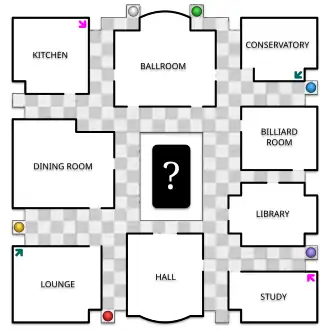 There are nine rooms in the mansion where the murder can take place,[27]: 121 laid out around the edge of the square game board. They consist of the hall, the lounge, the dining room, the kitchen, the ballroom, the conservatory, the billiard room, the library, and the study. Each of the four corner rooms contains a secret passage that leads to the room on the opposite diagonal corner of the map. The centre room (often referred to as the cellar or the stairs) is inaccessible to the players, but contains the solution envelope and is not otherwise used during gameplay. Each suspect token has a designated start space marked at the edge of the board. The corridor areas are marked out as square spaces through which the tokens move horizontally or vertically.