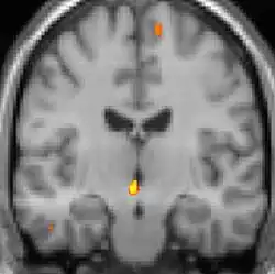 Positron emission tomography (PET) scans indicate the brain areas which are activated during attack only, compared to pain free periods. These pictures show brain areas that are active during pain in yellow/orange color (called "pain matrix"). The area in the center (in all three views) is activated only during cluster headaches. The bottom row voxel-based morphometry shows structural brain differences between individuals with and without CH; only a portion of the hypothalamus is different.[37]