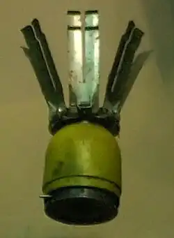 The first significantly operationally used[3] cluster bomb was the German SD-2 or Sprengbombe Dickwandig 2 kg, commonly referred to as the Butterfly Bomb.[4] Cluster munitions were used in World War II to attack both civilian and military targets,[5][6] including Tokyo and Kyushu.[7][8][9] The technology was developed independently by the United States, Russia and Italy (see Thermos bomb). The US used the 9-kilogram (20 lb) M41 fragmentation bomb wired together in clusters of six or 25 with highly sensitive or proximity fuzes.[10][11]