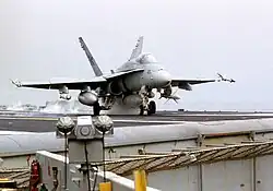 A US Navy F/A-18C Hornet launches from USS Nimitz to a mission in Southern Iraq. Among other weapons, the plane carries CBU-100 "Rockeye" cluster bombs.