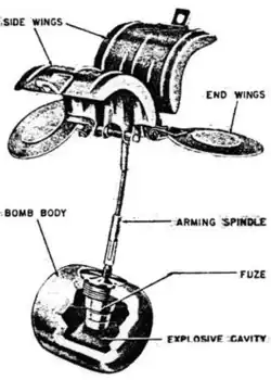 SD2 Butterfly Bomb circa 1940. Wings rotate as bomb falls, unscrewing the arming spindle connected to the fuze.