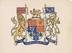 | Supporters | Dexter: a lion or holding a lance argent, point or, flying therefrom to the dexter the Royal Union Flag, sinister: a unicorn argent armed, crined and unguled or, gorged with a coronet composed of crosses-patée and fleurs-de-lis a chain affixed thereto and reflexed or, holding a like lance flying therefrom to the sinister a banner azure charged with three fleurs-de-lis or. |